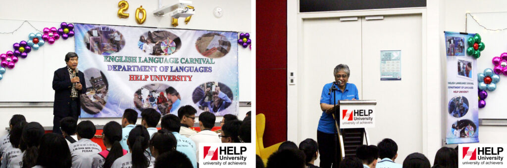 Left: Dr Khong Kim Hoong, Deputy Vice-Chancellor (Academic) of HELP University delivering his speech Right: Dr Hannah Pillay, Head of the Department of Languages, delivering her speech.